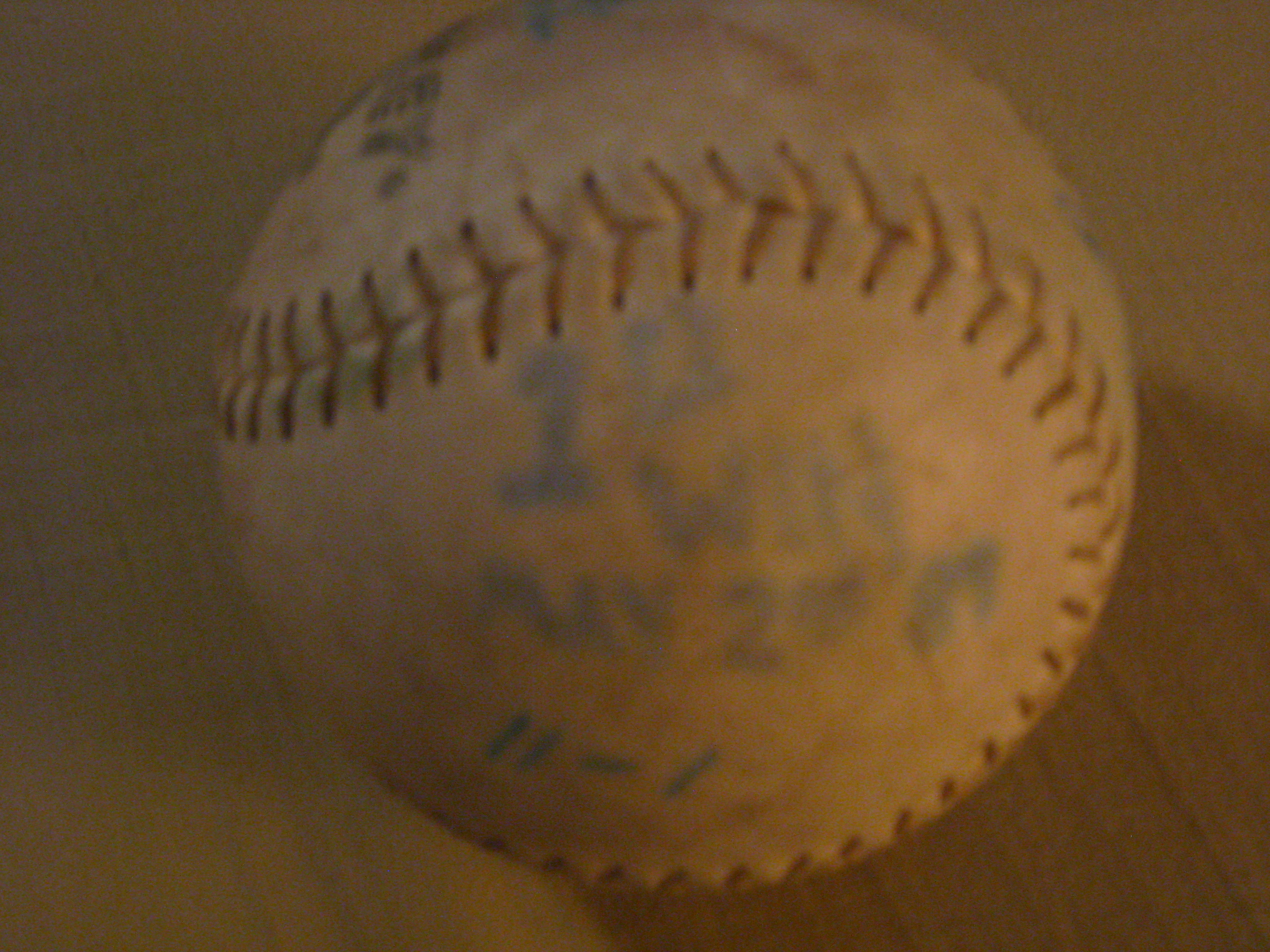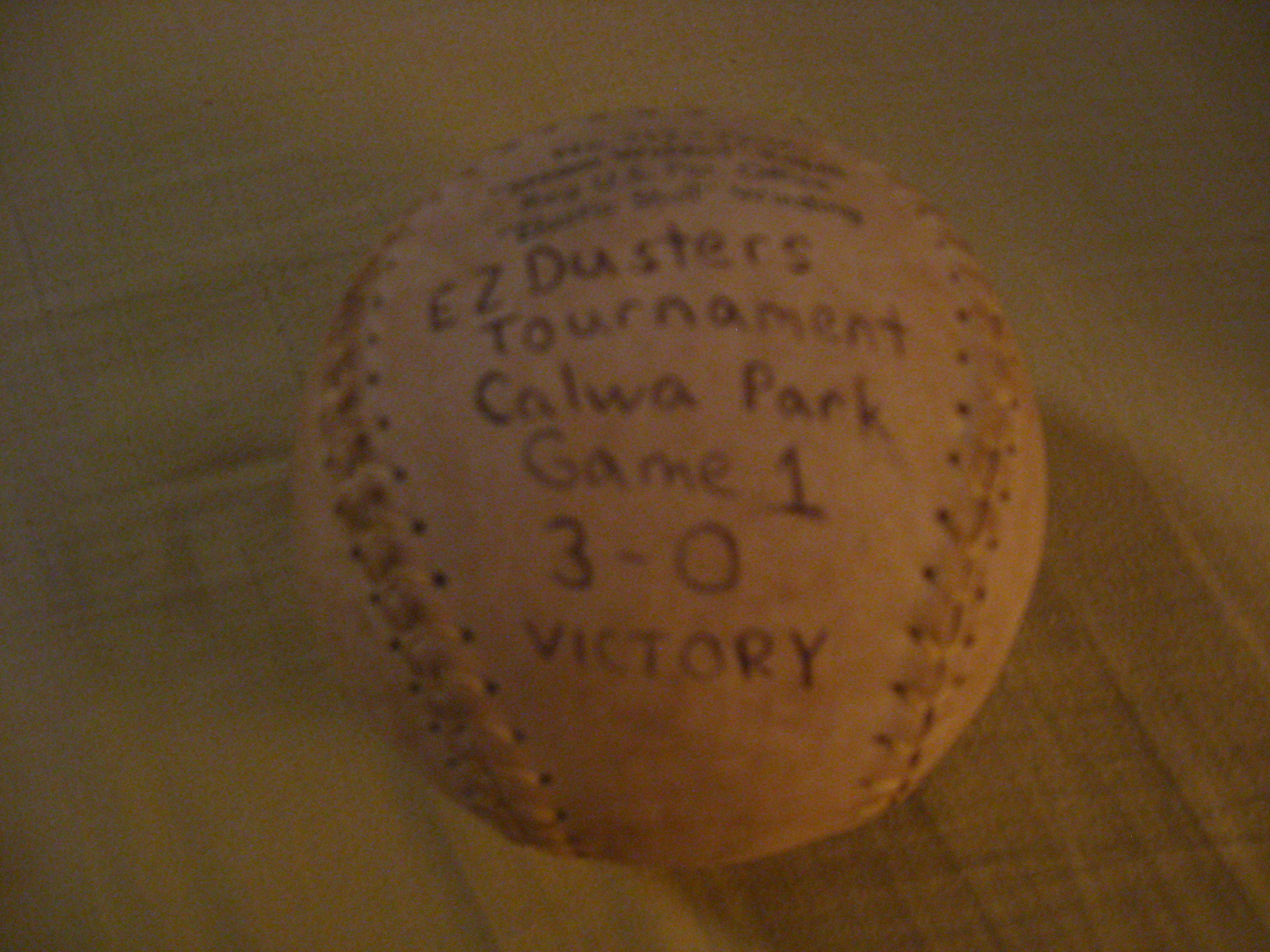 We ended up a close 3rd as I recall and I had to admit, I had some good games at pitcher. Here is our first win ball. The picture on the right says 1st Win May 2nd, 1989. Score 11-0. Woohoo! The 1st picture shows some of the autographs by team members. All had signed it.